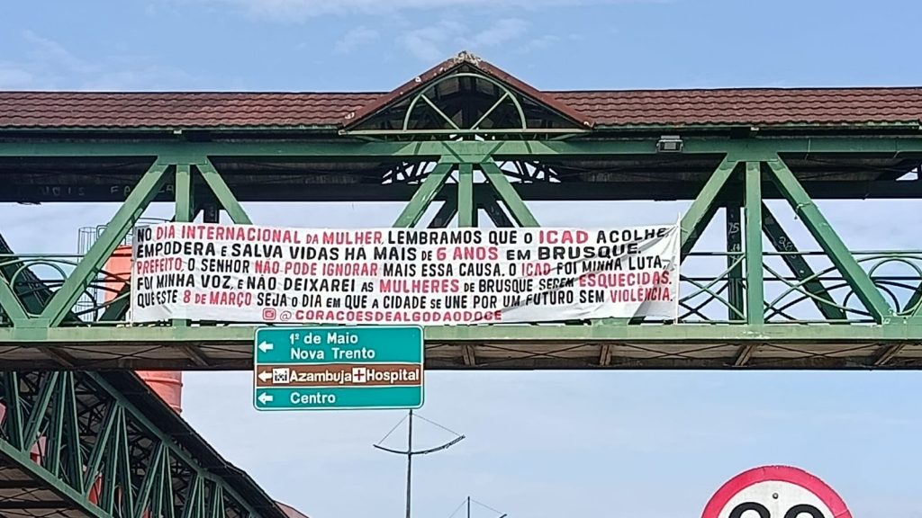 No texto, a faixa destaca o trabalho desenvolvido pelo Instituto Corações de Algodão Doce (ICAD) e faz uma cobrança pública ao prefeito. A mensagem afirma: “No Dia Internacional da Mulher, lembramos que o ICAD acolhe, empodera e salva vidas há mais de 6 anos em Brusque. Prefeito, o senhor não pode ignorar mais essa causa. O ICAD foi minha luta, foi minha voz, e não deixarei as mulheres de Brusque serem esquecidas. Que este 8 de março seja o dia em que a cidade se une por um futuro sem violência”.