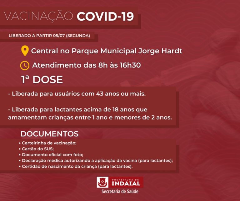 A partir desta segunda, 5 de julho, a Secretaria de Saúde de Indaial libera a vacinação contra a Covid-19 para pessoas com 43 anos ou mais e…