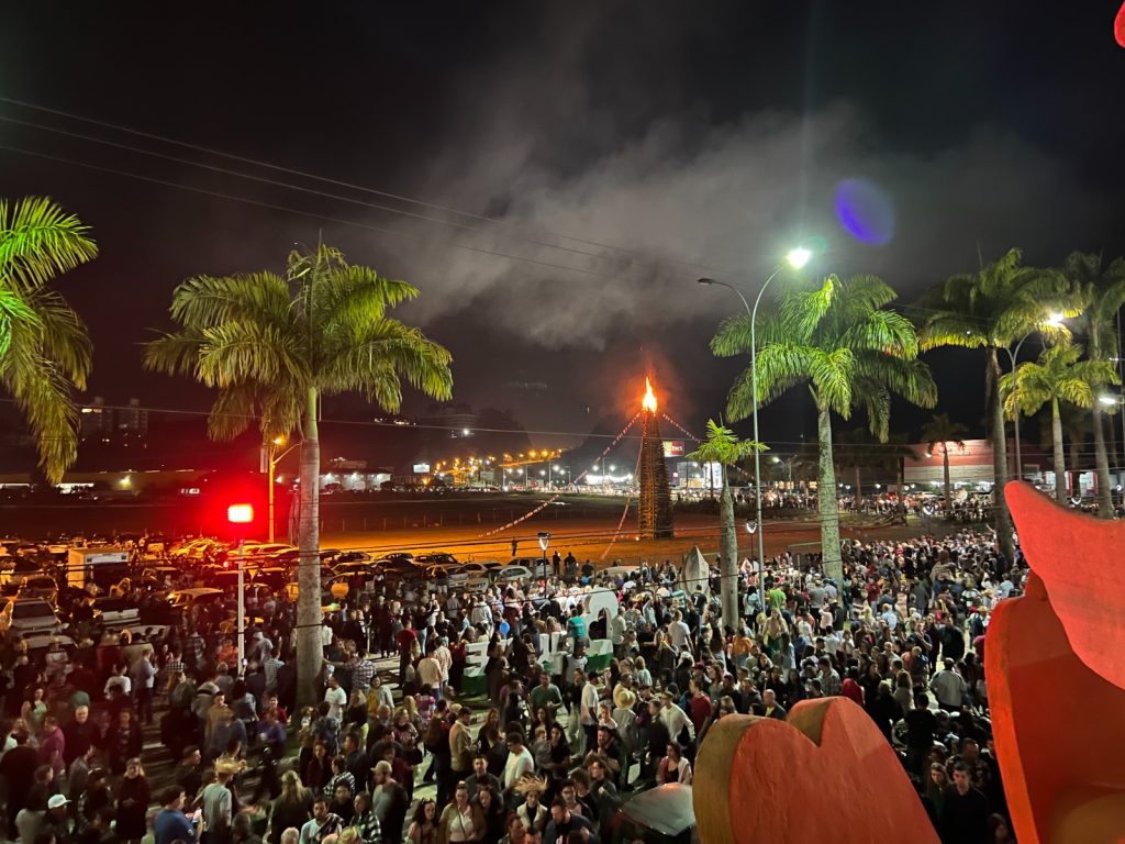 Um dos momentos mais aguardados da noite foi o acendimento da fogueira e o show pirotécnico com fogos silenciosos. Perto das 20h o publico foi convidado a se dirigir para frente do Pavilhão, que estava com a rua fechada, para que todas pudessem prestigiar o grande momento. A contagem regressiva iniciou, e quando toda a galera gritou “um”, o show começou. Um momento histórico para Brusque.